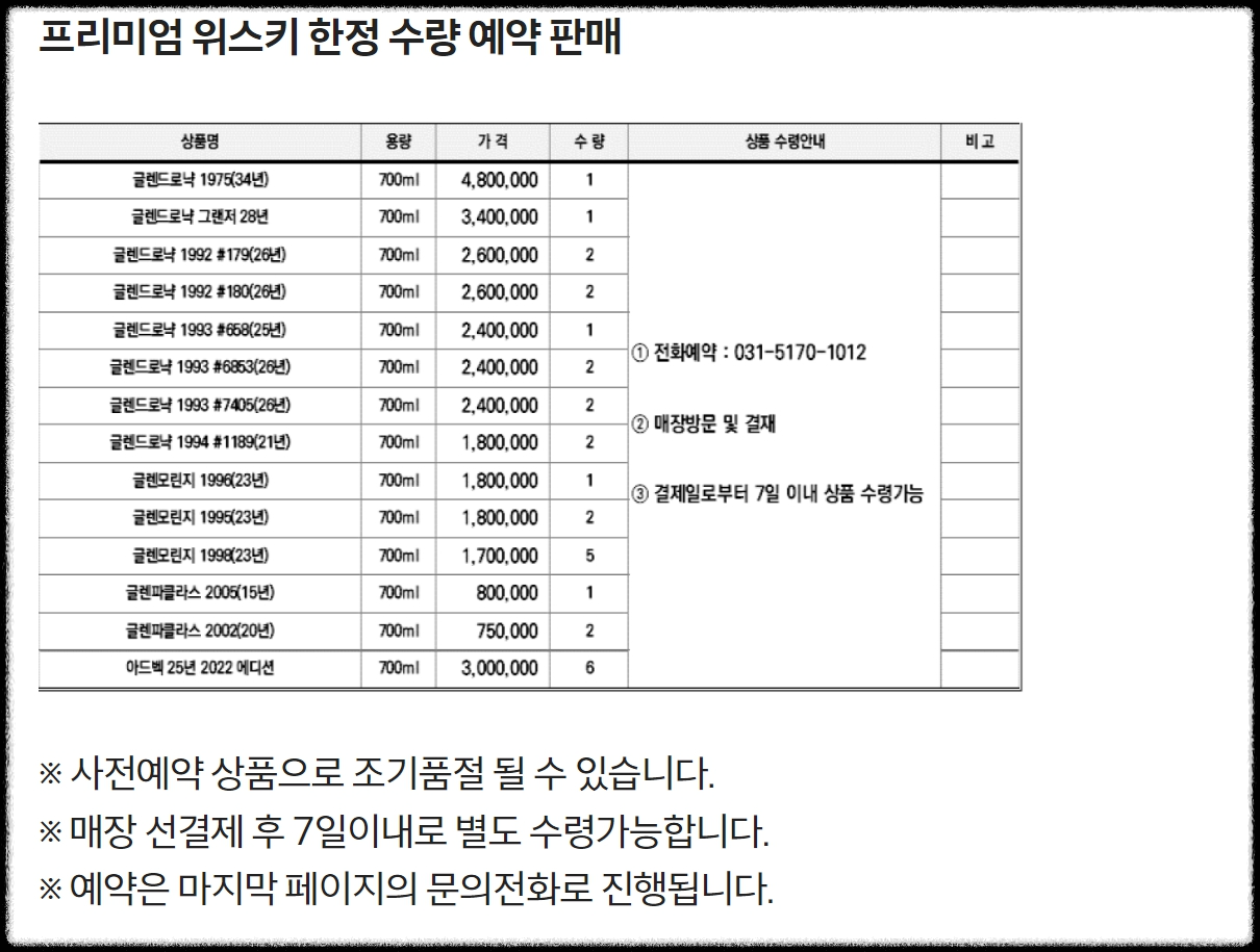 프리미엄 위스키 한정 수량 예약판매이다.