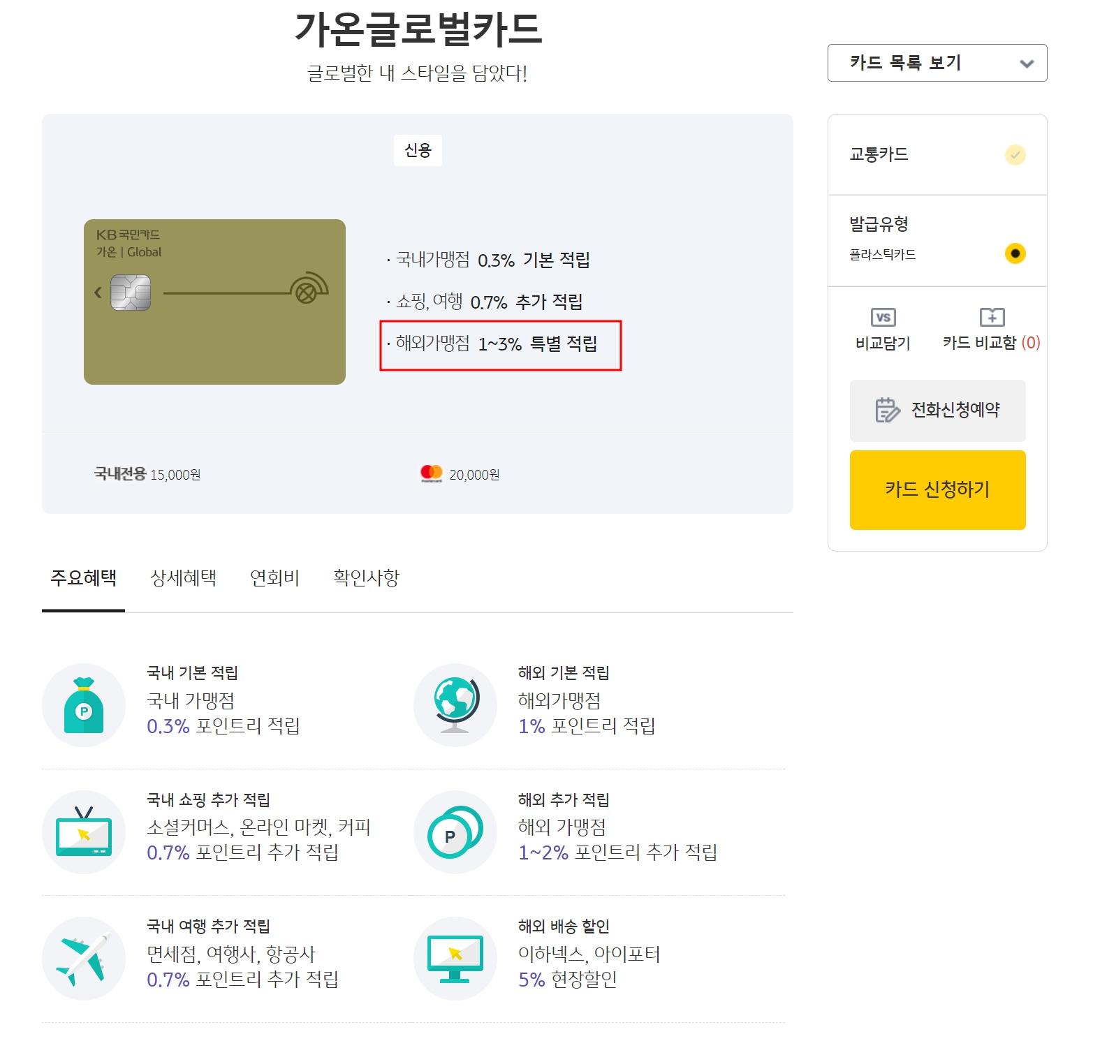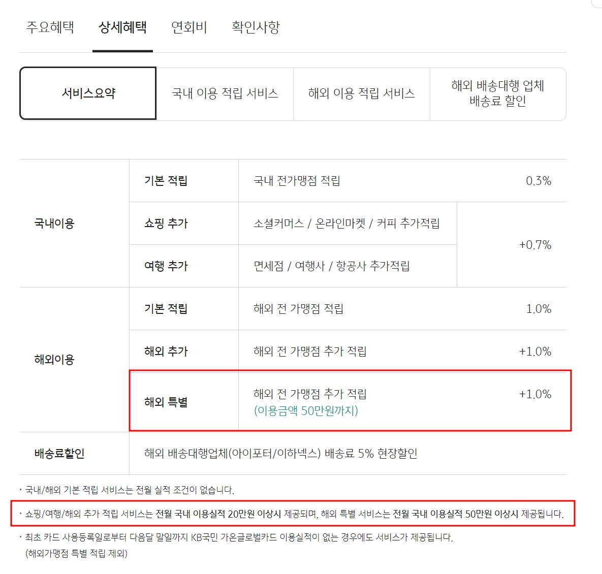 전월 국내 이용실적이 50만 원 이상시 해외 특별 1%가 추가된다.
